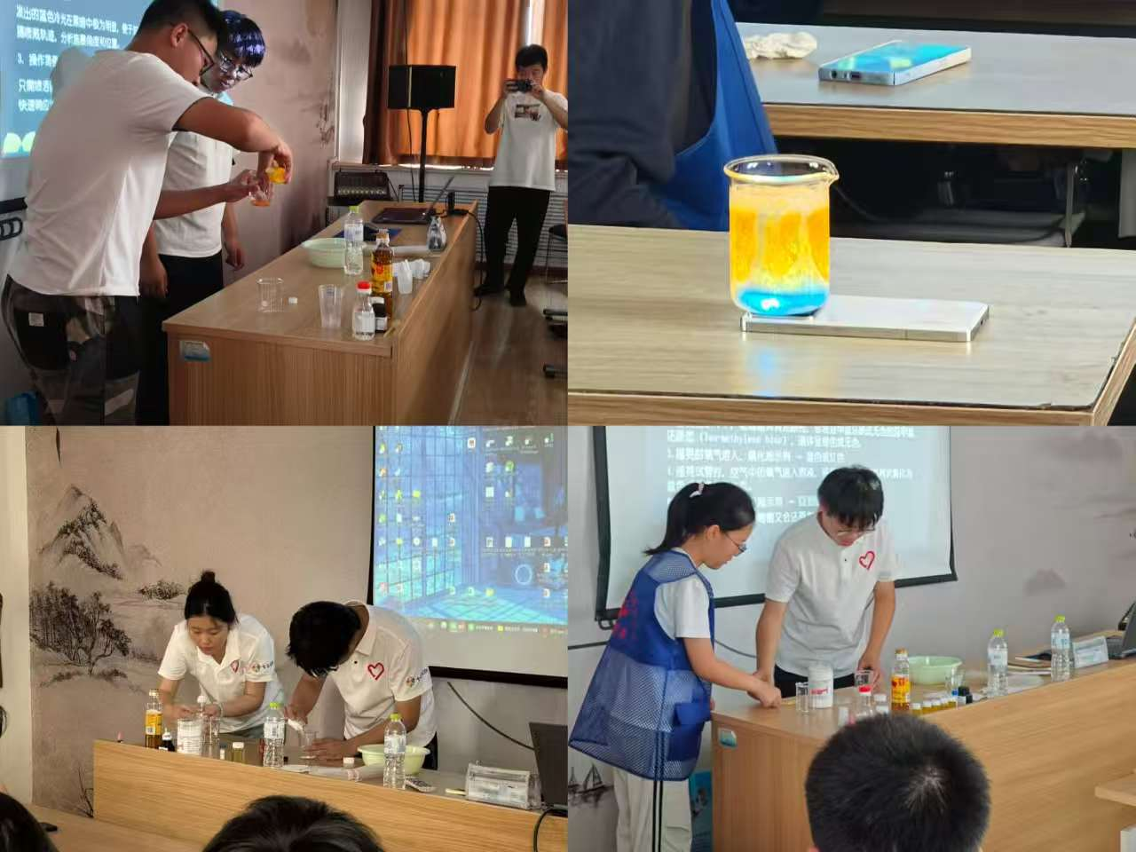 在这次活动中,志愿服务队为同学们精心设计了“熔岩灯实验”“红绿灯实验”和“鲁米诺荧光实验”三个趣味实验项目。在“熔岩灯实验”中,同学们观察到水油分层现象以及泡腾片反应产生的气泡变化,宣讲组成员左玉祥详细讲解了密度差异和化学反应原理。随后的“红绿灯实验”通过亚甲基蓝溶液的颜色变化,非常直观的展示了氧化还原反应的过程。最后的“鲁米诺荧光实验”则让同学们见证了化学发光的奇妙现象,现场惊叹声不断。