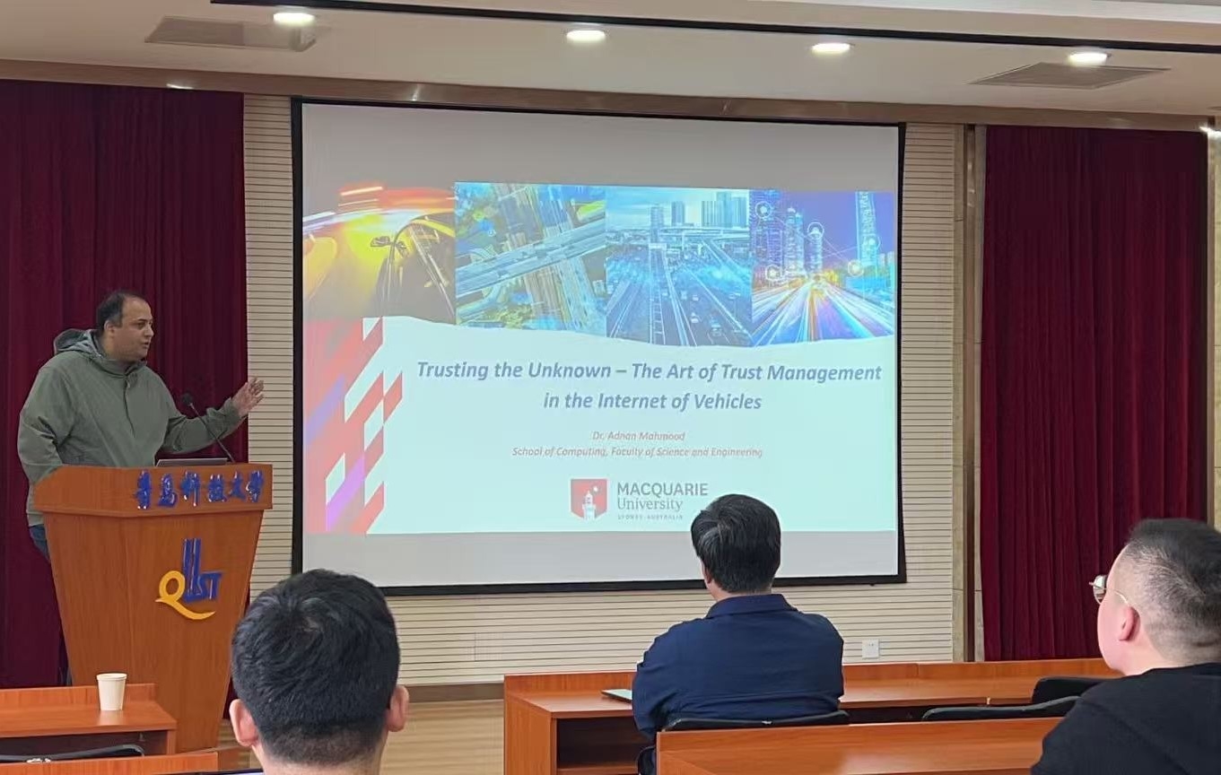 2025年4月3日,学院邀请澳大利亚麦考瑞大学Mahmood博士为学院师生作题为“信任未知——车联网中的信任管理艺术”的学术报告,并就相关前沿问题进行了深入探讨。报告由学院副院长陶冶教授主持,学院30余名师生参加。