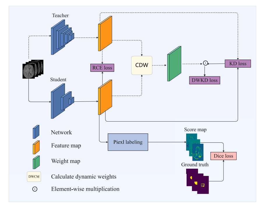 近日,乐竞官网2021级研究生安典龙在人工智能领域顶级期刊Pattern Recognition (IF=7.5) 发表了题为“Dynamic Weighted Knowledge Distillation for Brain Tumor Segmentation”的高水平论文,报道了压缩脑肿瘤模型的算法——DWKD。该算法在压缩脑肿瘤模型上表现出非常优秀的性能。